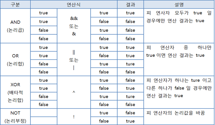 - && 과 & 의 결과값은 같지만, &&의 경우 앞의 피연산자가 false면 뒤를 계산하지 않고 false를 리턴한다. ||와 |도 마찬가지 ( 좀더 효율적)