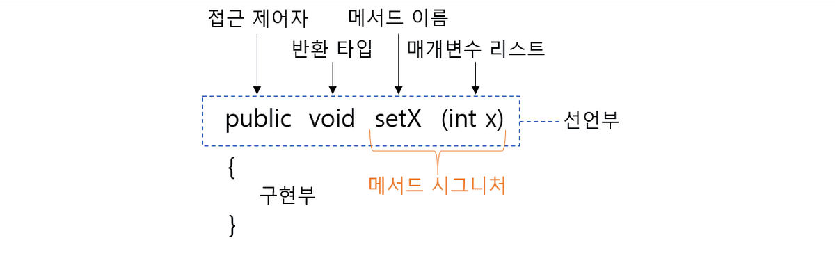 - method : 객체의 동작에 해당되는 실행 블록
