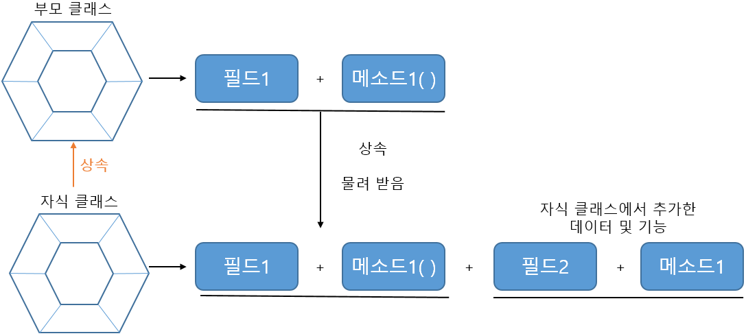 자바에서도 객체 지향 프로그램의 상속의 기본 개념처럼, 부모 클래스(상위 클래스)의 필드와 메소드를 자식 클래스( 하위 클래스, 파생 클래스)에서 물려받는 것을 상속(Inheritance)이라고 한다.