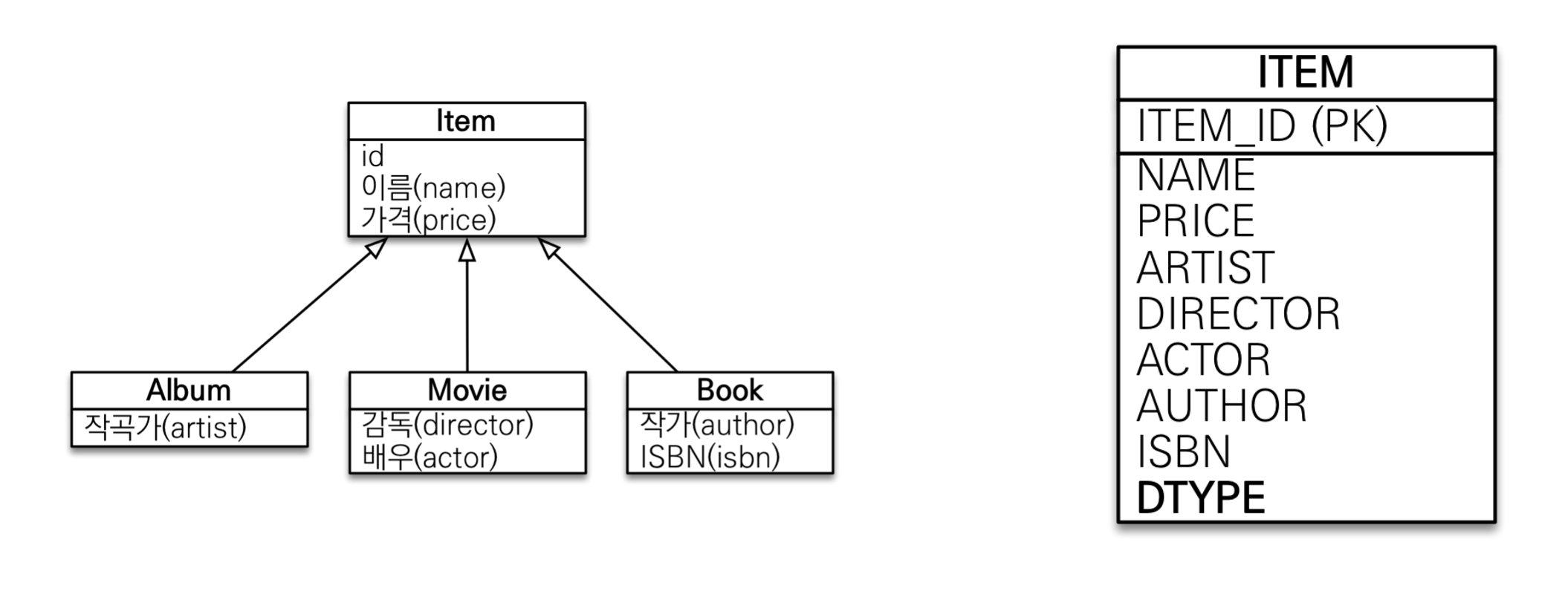 - 통합 테이블로 변환 → 단일 테이블 전략 (JPA 기본 전략)